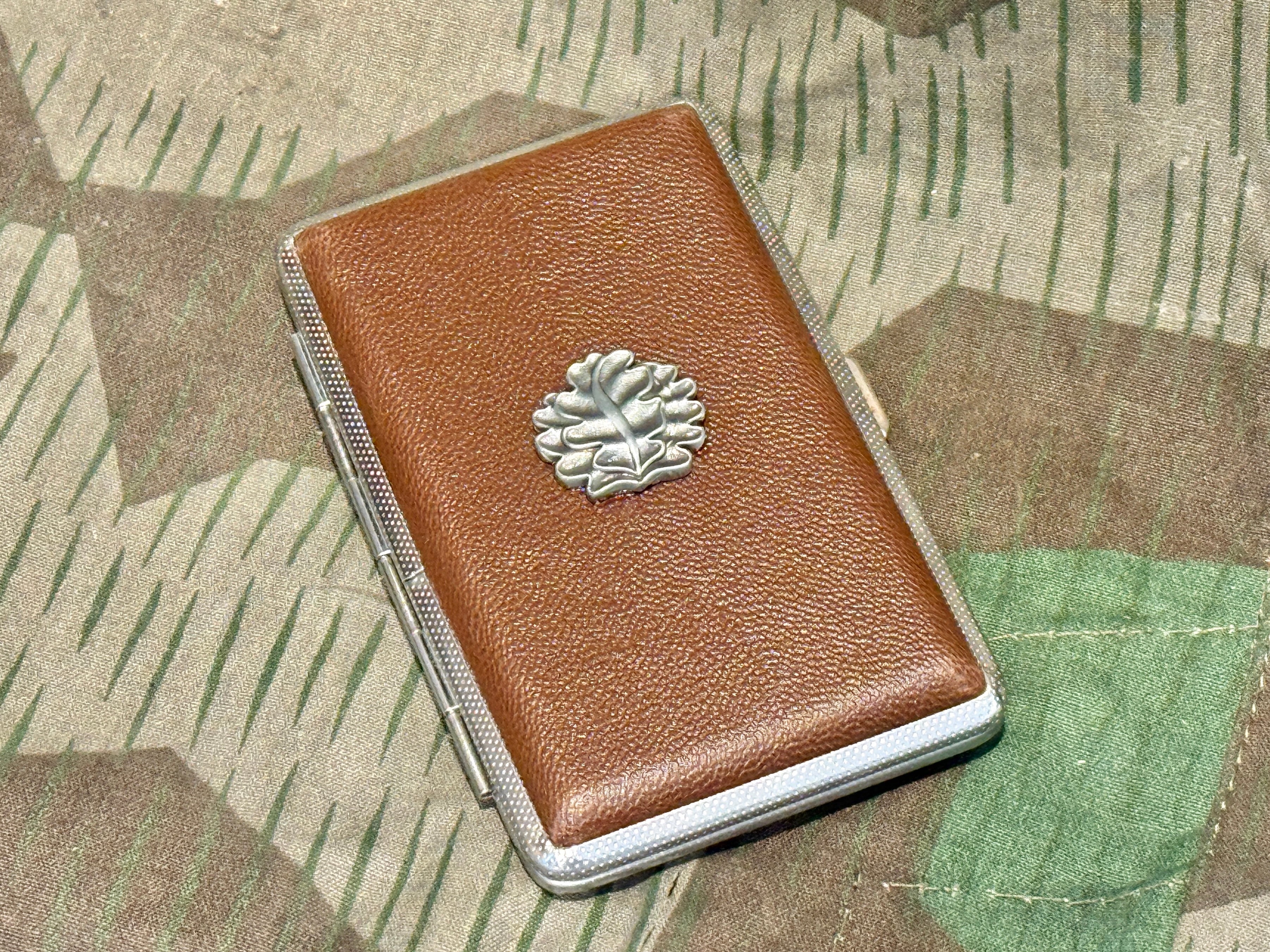 柏葉のレリーフがあしらわれたスリムタイプのシガレットケース。