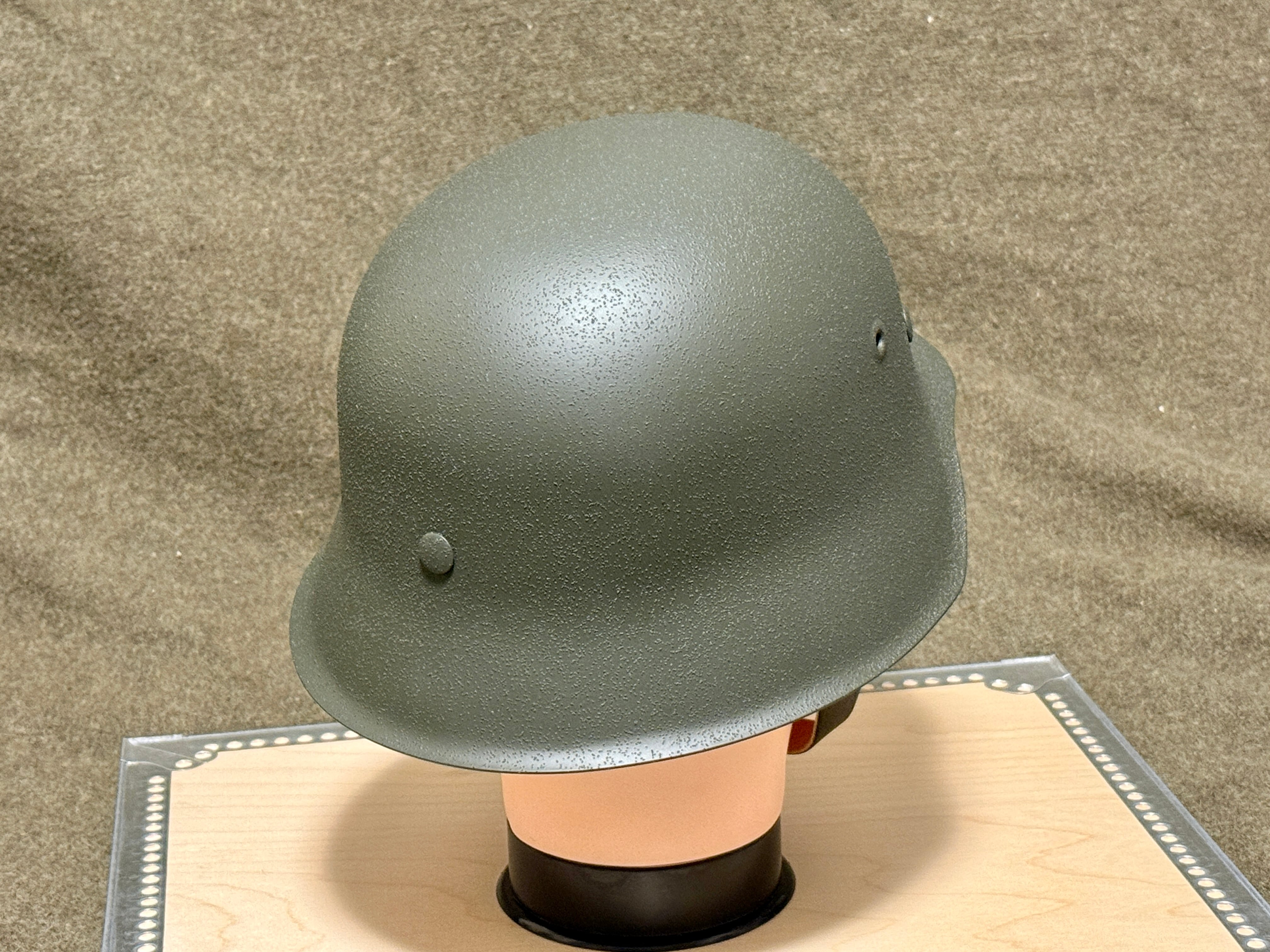 第二次世界大戦ドイツ軍のM42スチールヘルメットのリプロダクションモデル(新品)に反射を抑える目的の酸化アルミニウム(アルミナダスト)によるテクスチャー塗装を施したカスタム品。(砂やコルクを用いた例もあったようです)