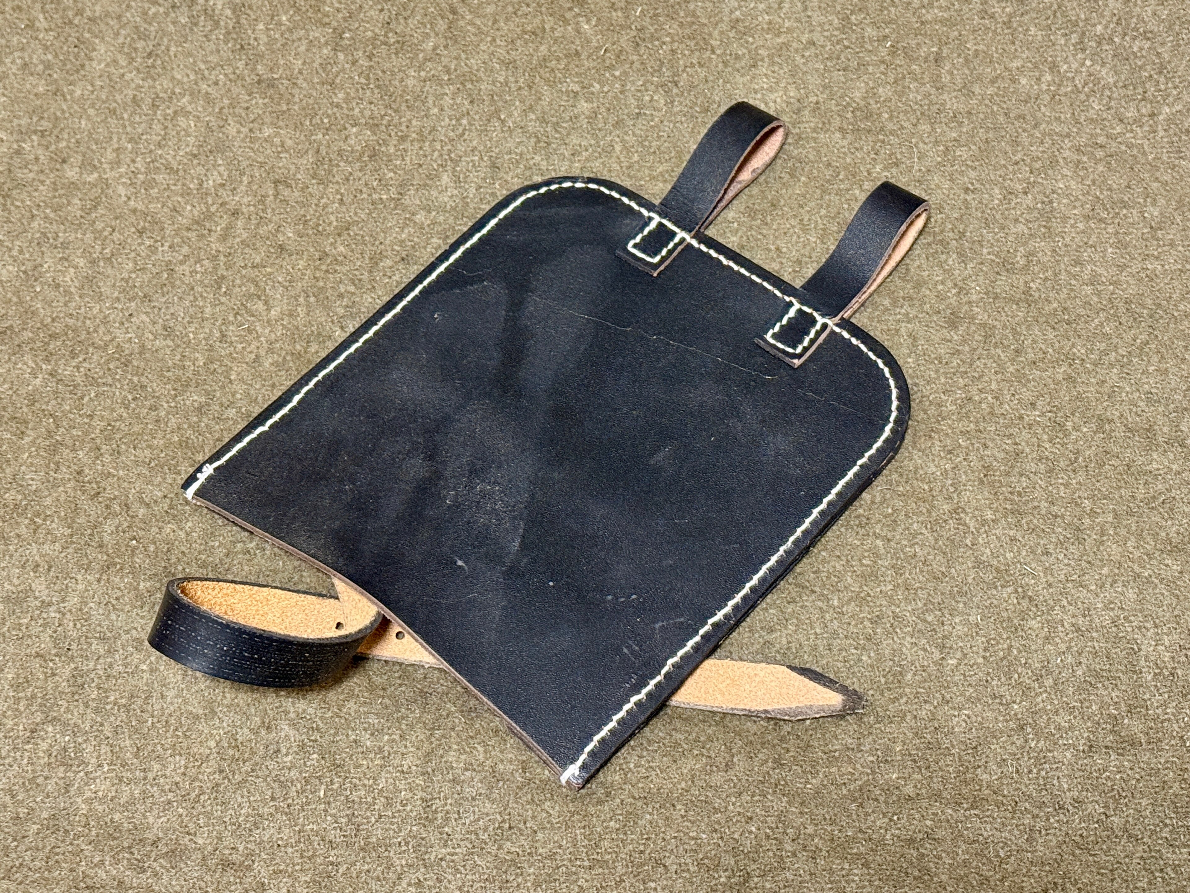 第二次世界大戦ドイツ軍で使われた平スコップを収納する革製ケースのリプロダクションモデル。