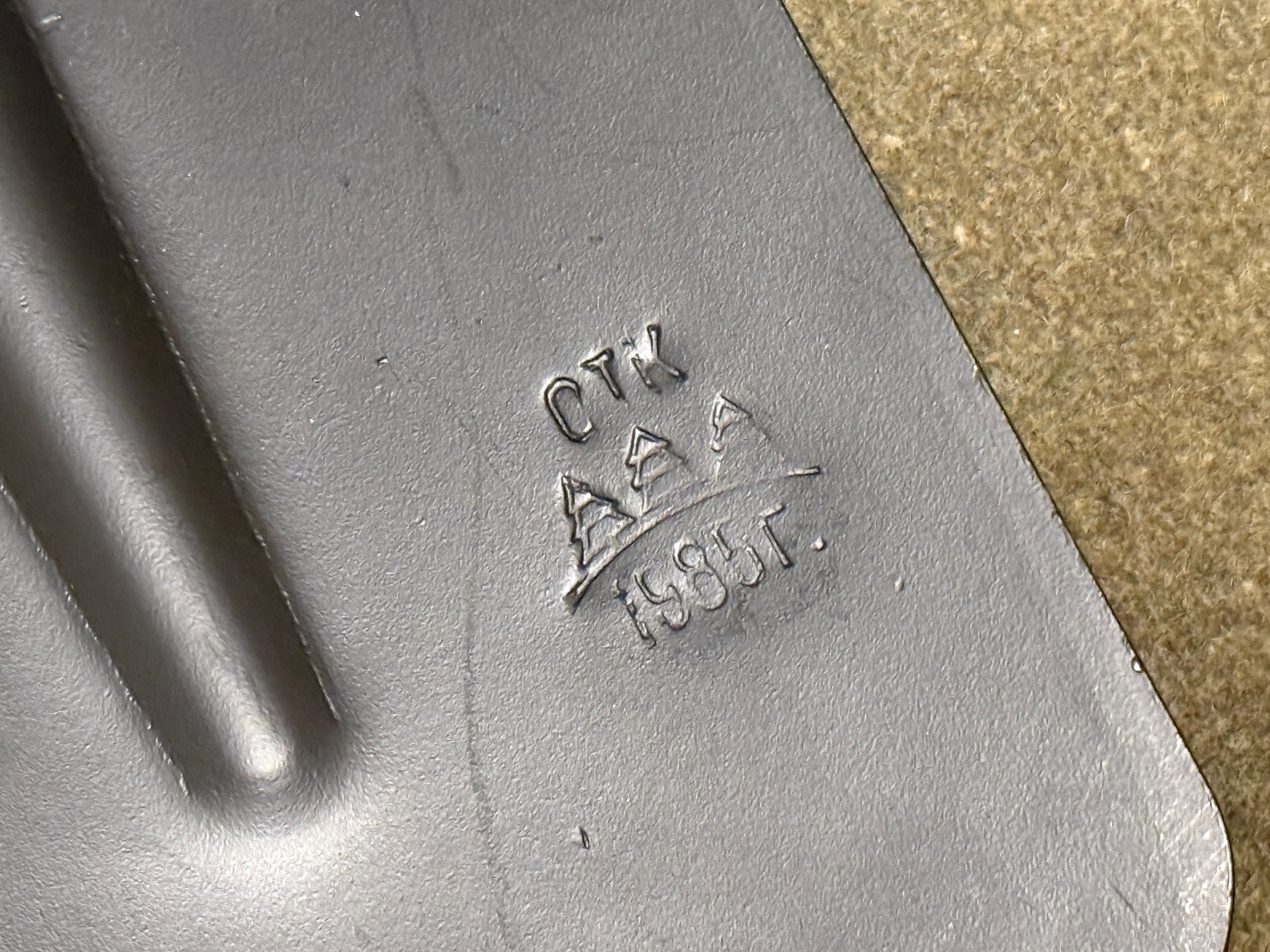 軍放出のデッドストック品(未使用)であり、当時の軍需工場で打たれたメーカー刻印やスタンプが金属部に残っています。