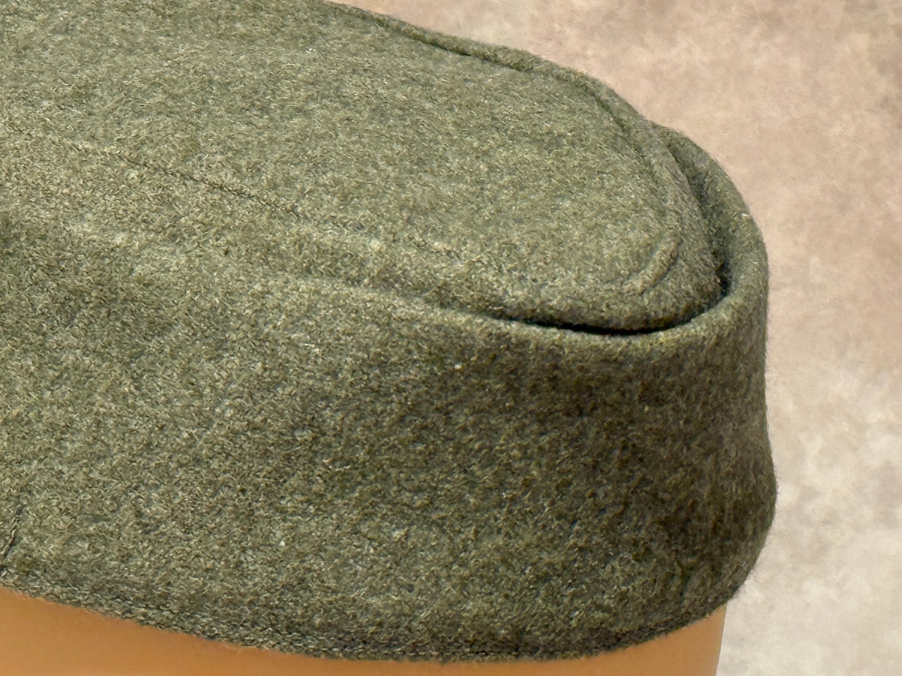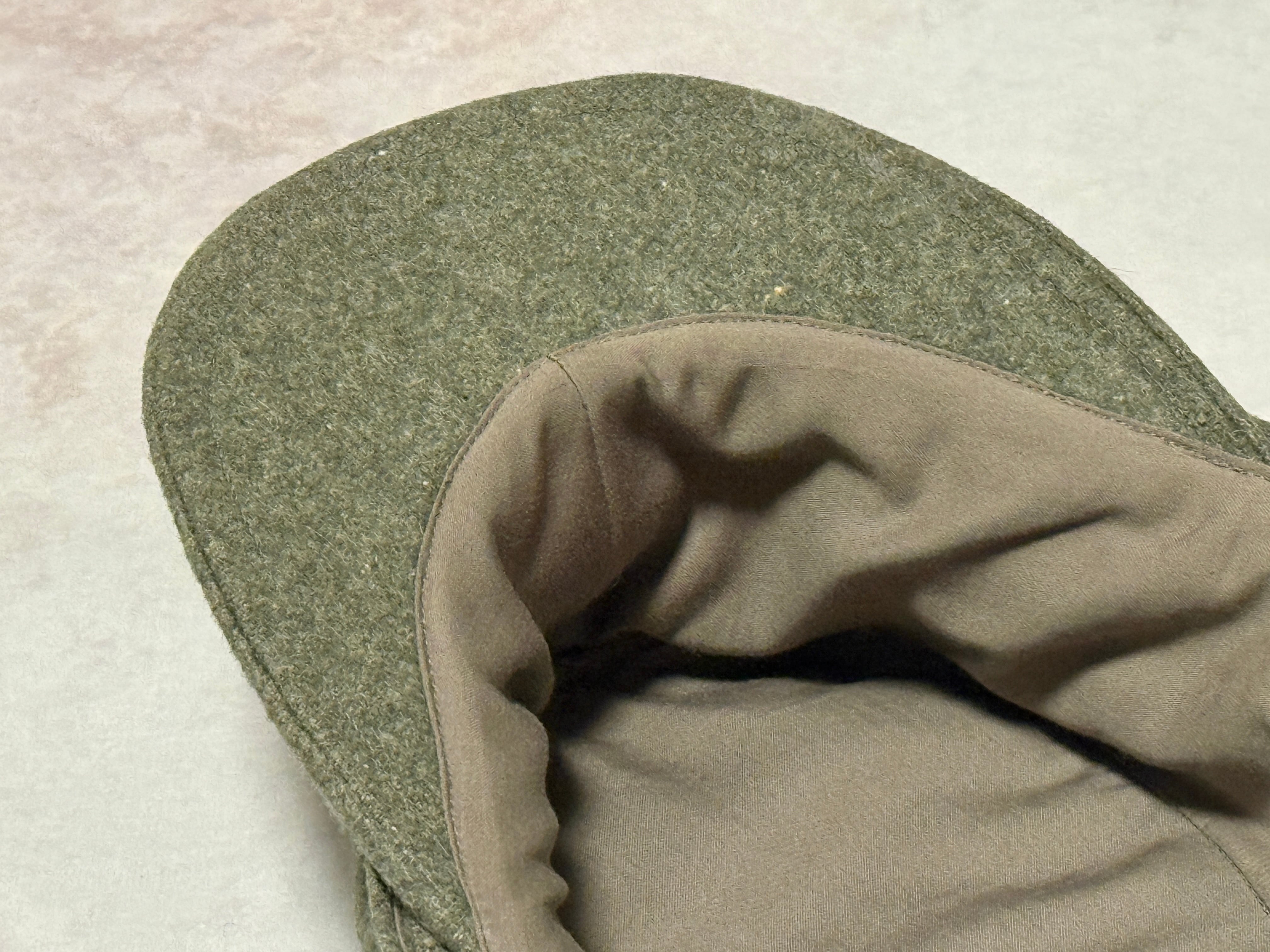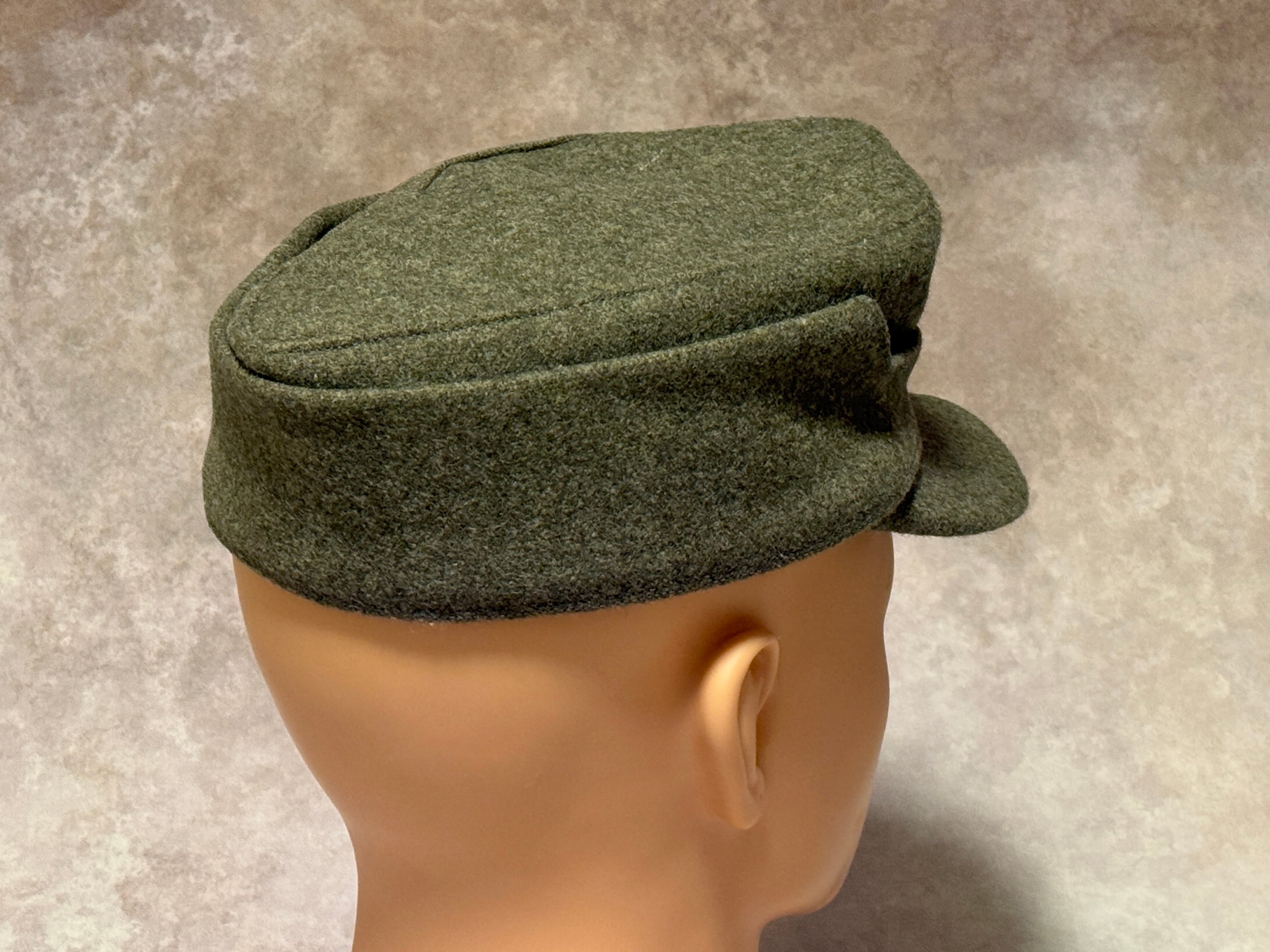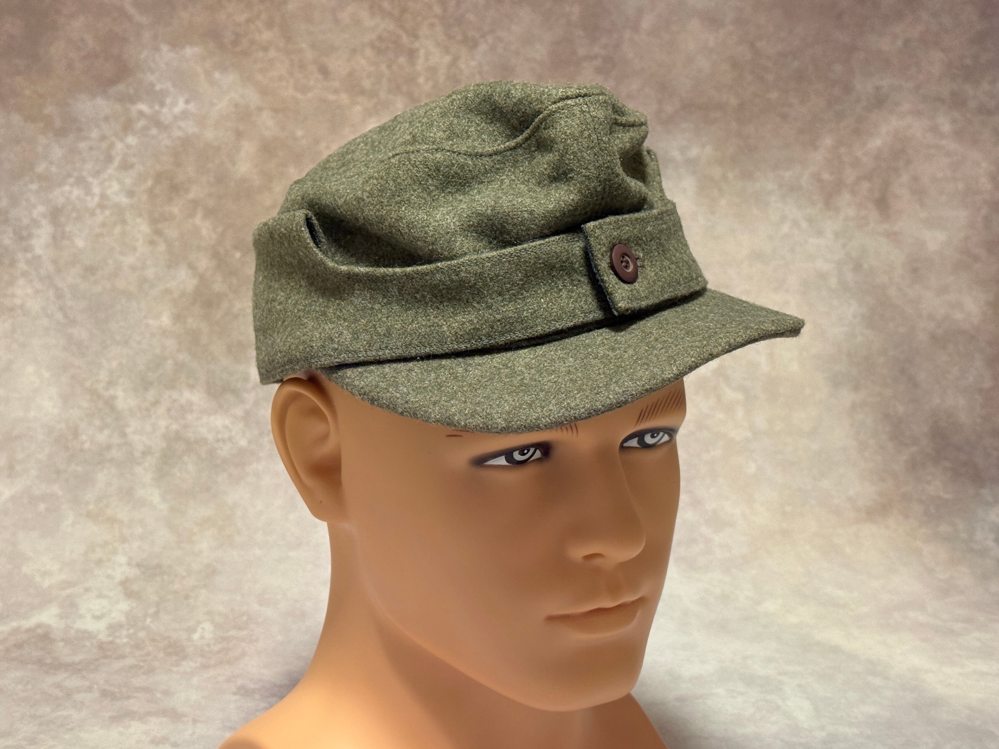第二次世界大戦ドイツ軍SSM型43規格帽の徽章付き高品質リプロダクションモデル。1つボタンの末期44年タイプで後ろ合せが1枚取りのSS型タイプ。